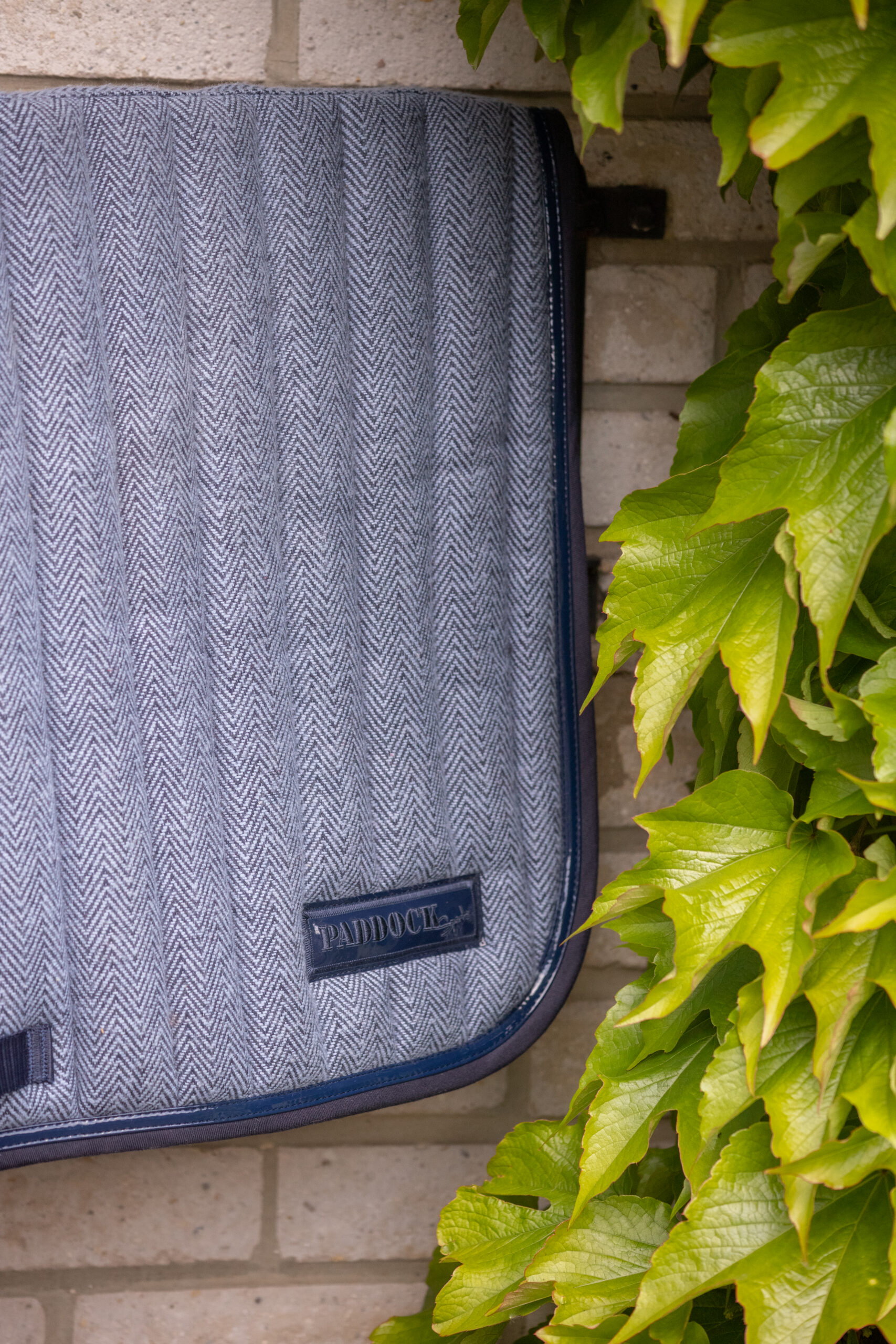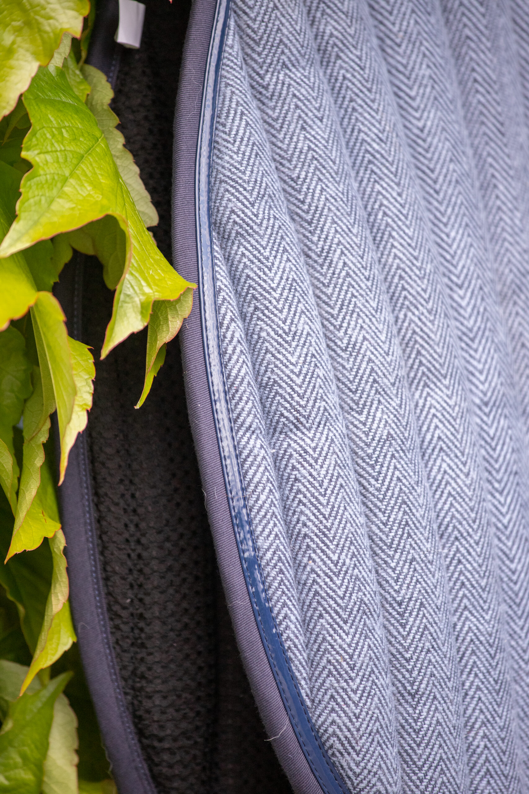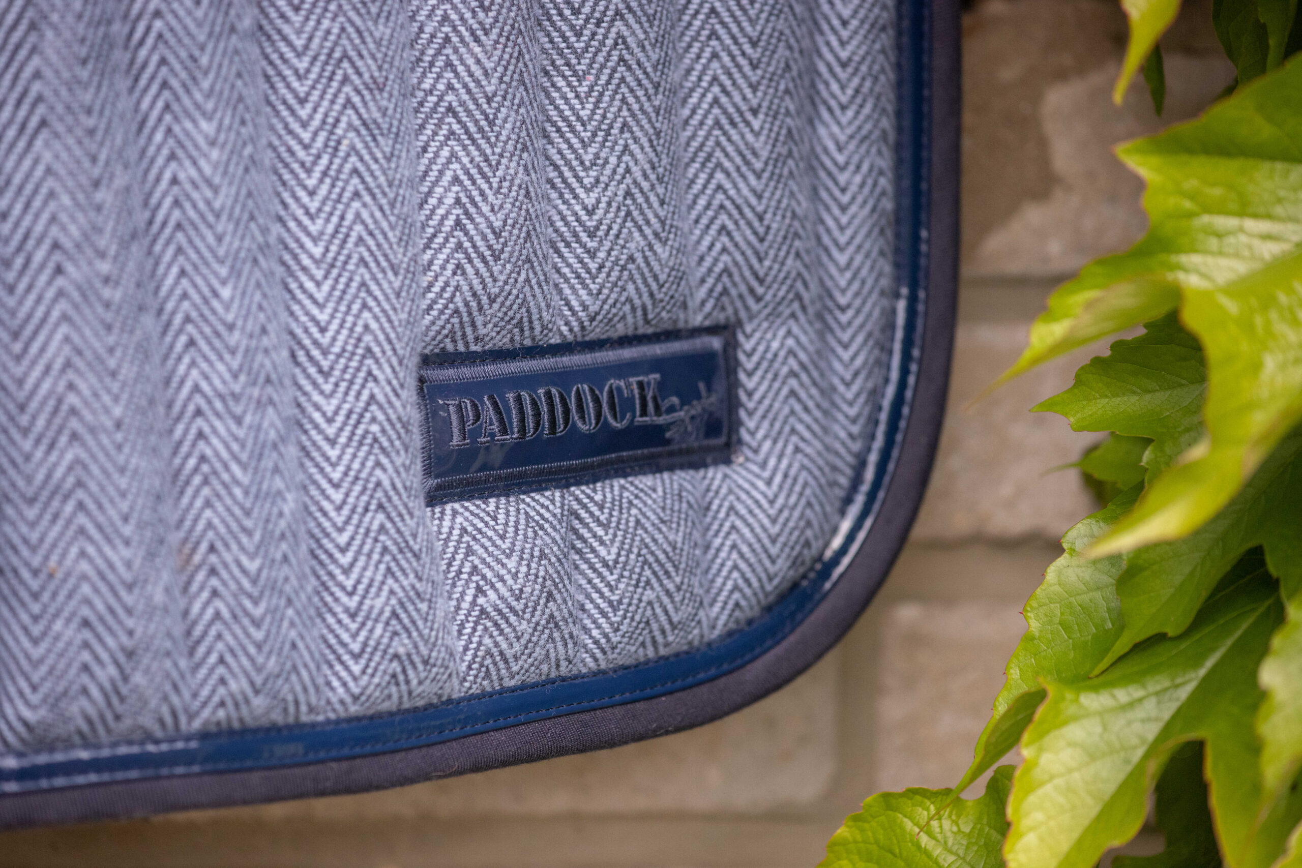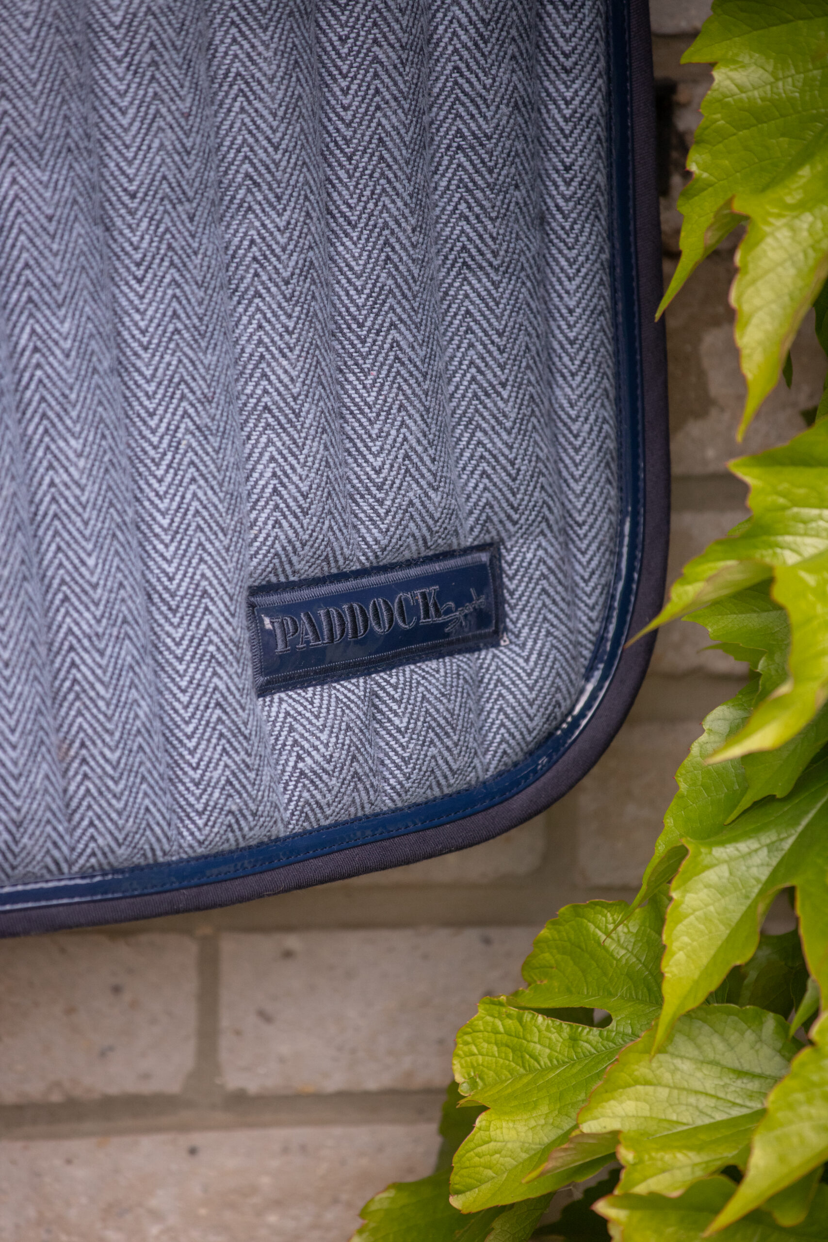 Wooltouch Paddock Sports saddle pad, made from a thick fabric with a very chic chevron pattern. A classic shaped pad signed Paddock Sports and available in gray or blue and trimmed with a varnish. On the back, a varnished patch with the Paddock Sports logo is sewn and perfectly finishes the look of this Paddock Sports creation. Composition: Exterior: 55% Polyester and 45% Wool – Filling: 100% Polyester and 100% Polyurethane – Lining: 100% Cotton Size Horse Care instructions: