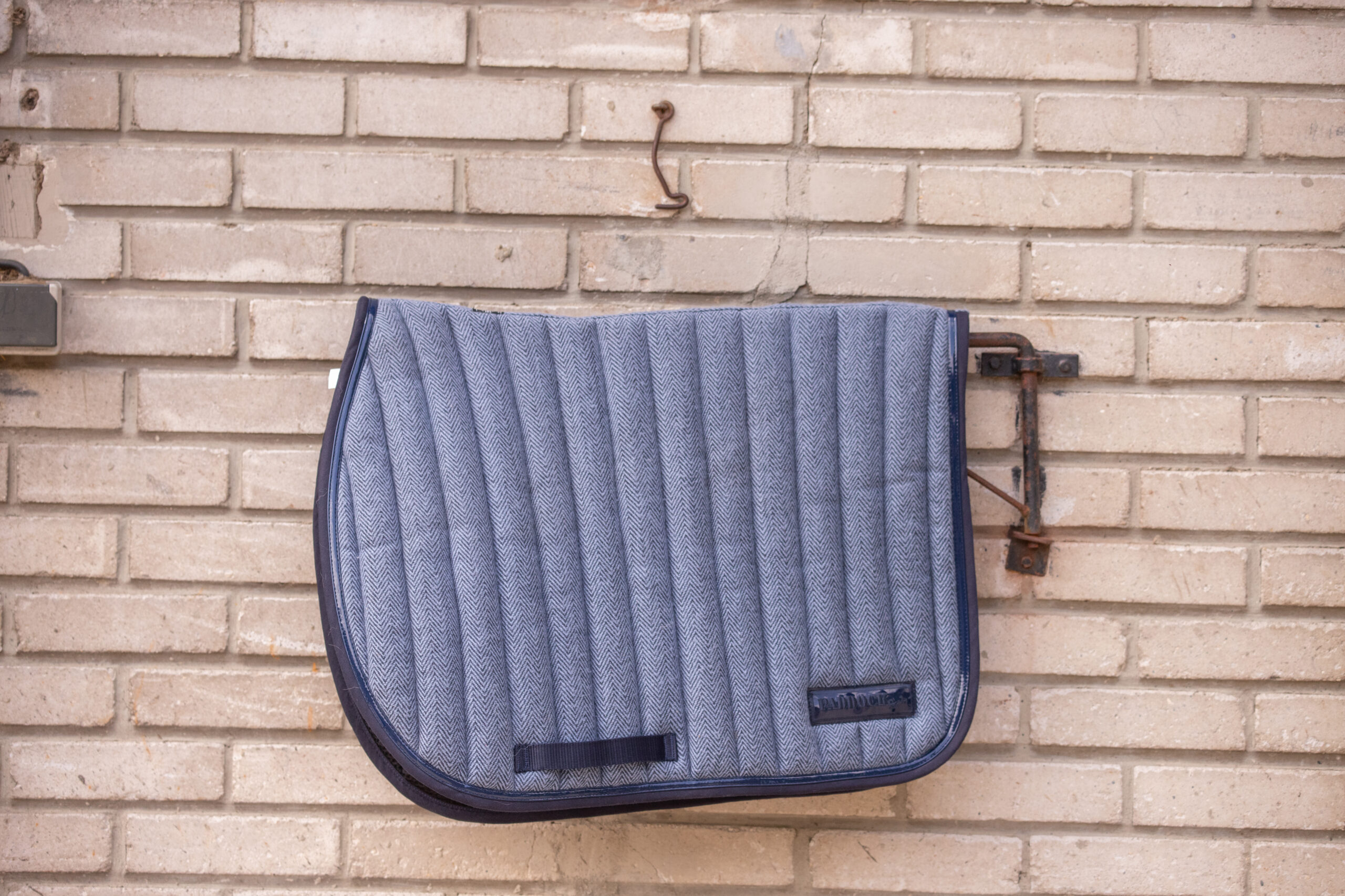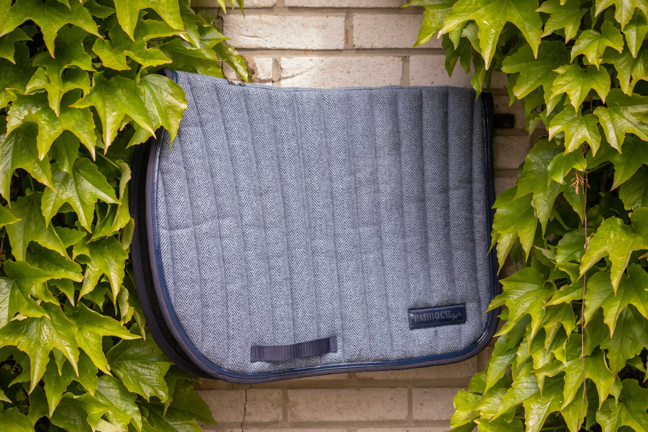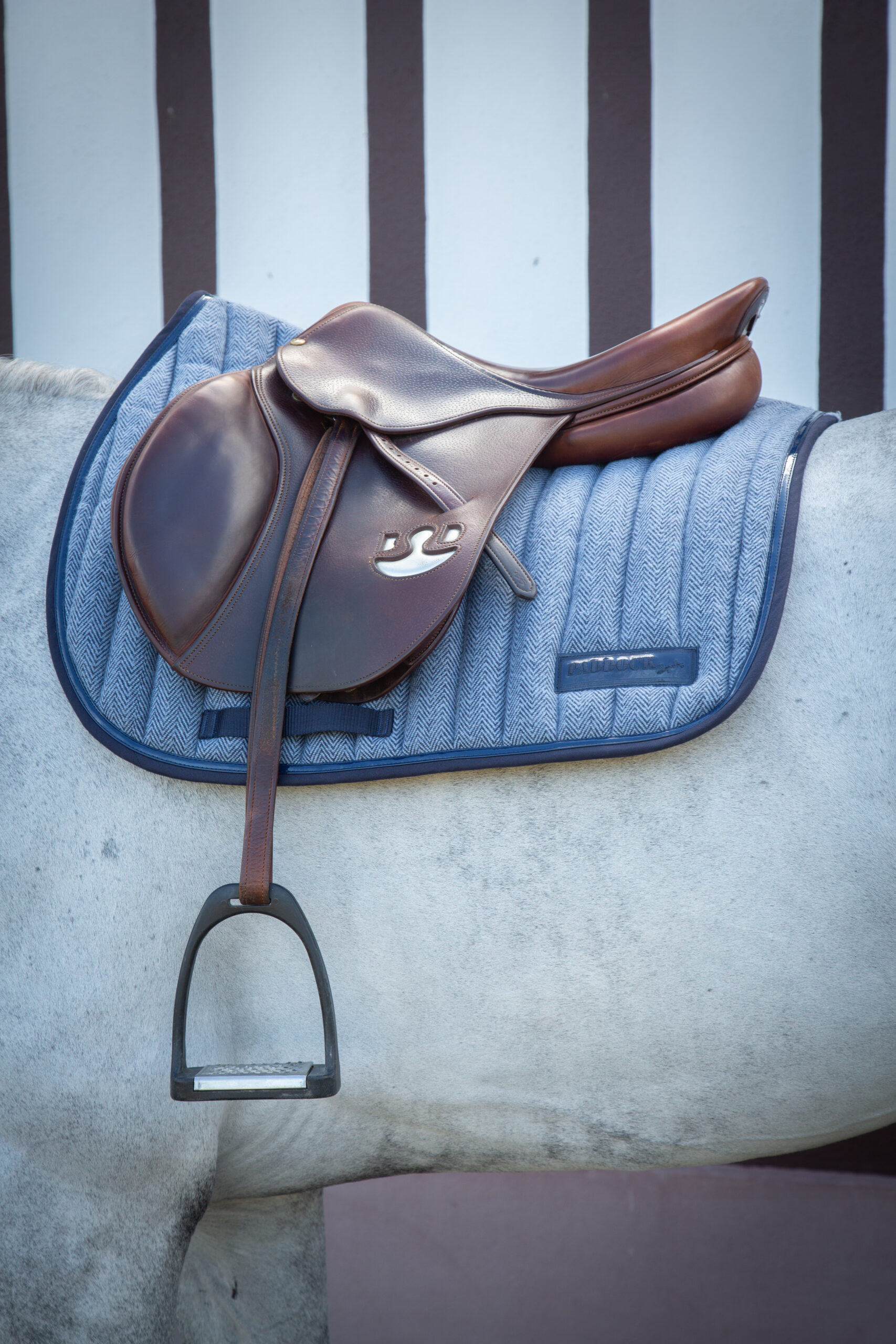Wooltouch Paddock Sports saddle pad, made from a thick fabric with a very chic chevron pattern. A classic shaped pad signed Paddock Sports and available in gray or blue and trimmed with a varnish. On the back, a varnished patch with the Paddock Sports logo is sewn and perfectly finishes the look of this Paddock Sports creation. Composition: Exterior: 55% Polyester and 45% Wool – Filling: 100% Polyester and 100% Polyurethane – Lining: 100% Cotton Size Horse Care instructions: