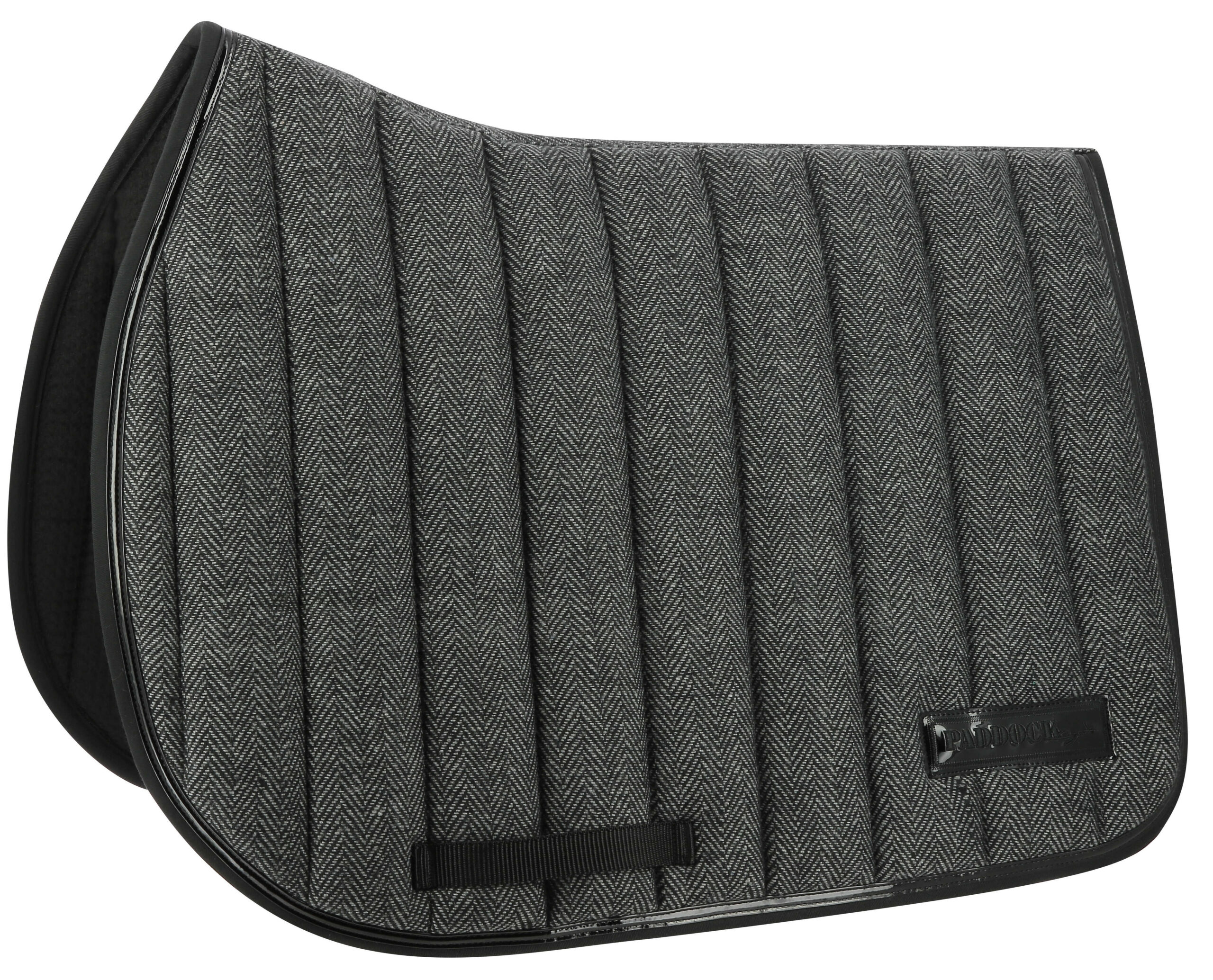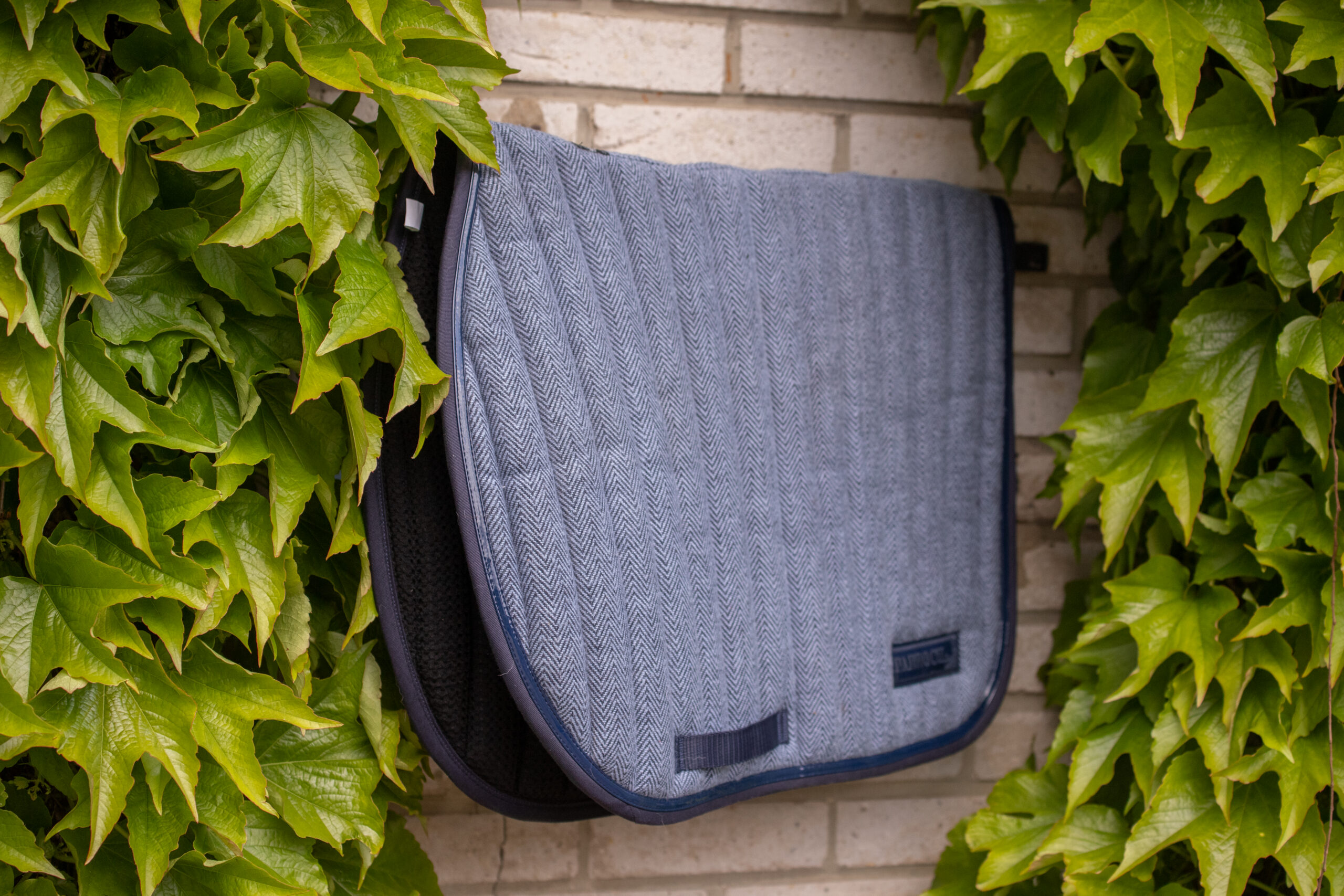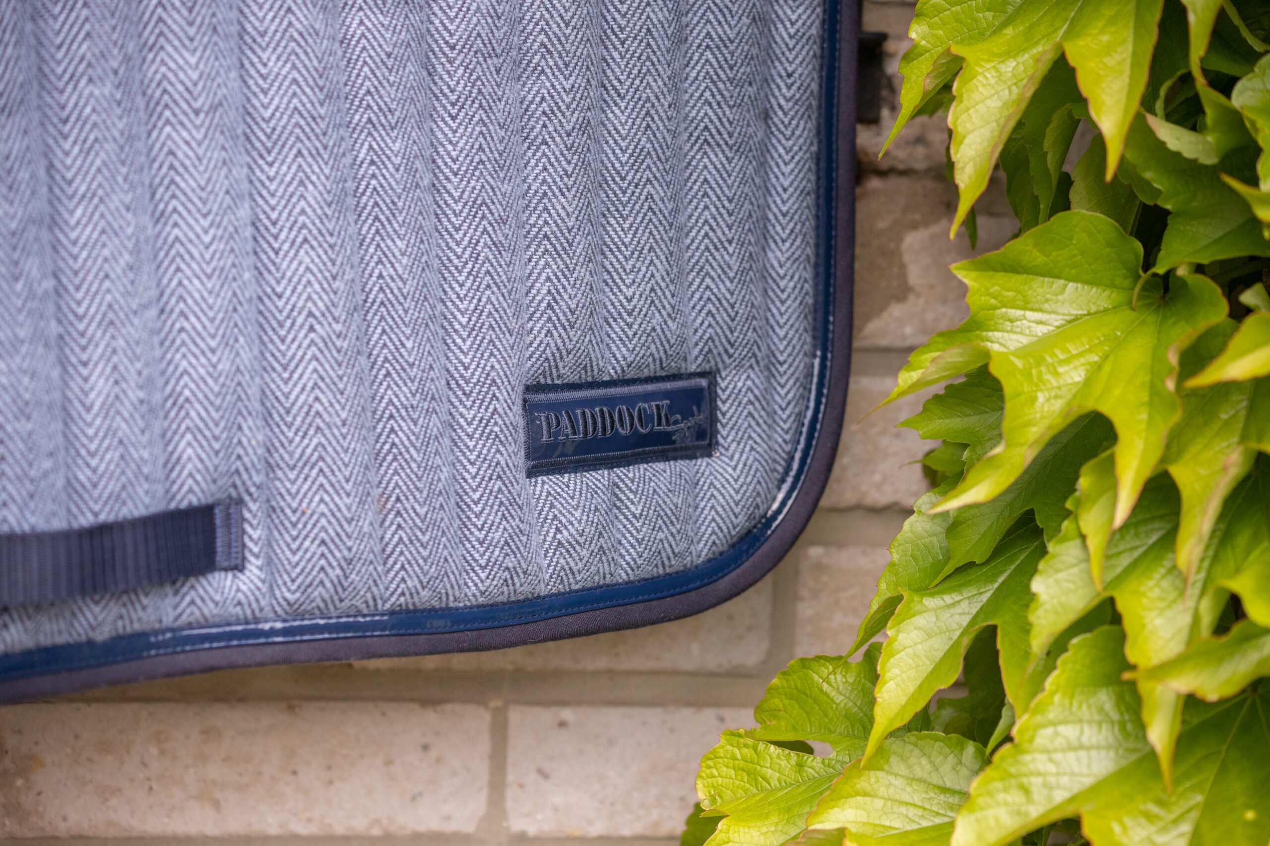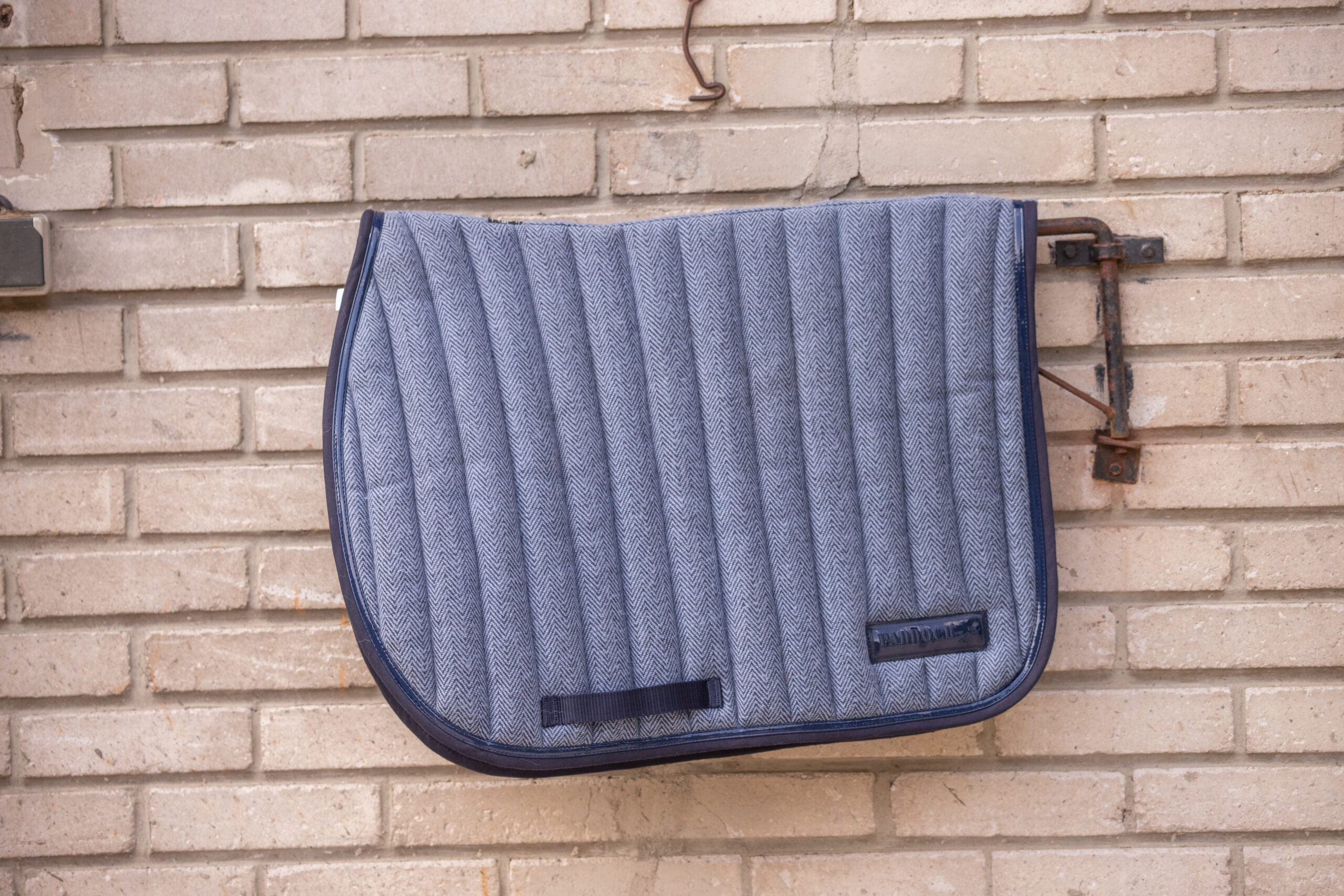 Wooltouch Paddock Sports saddle pad, made from a thick fabric with a very chic chevron pattern. A classic shaped pad signed Paddock Sports and available in gray or blue and trimmed with a varnish. On the back, a varnished patch with the Paddock Sports logo is sewn and perfectly finishes the look of this Paddock Sports creation. Composition: Exterior: 55% Polyester and 45% Wool – Filling: 100% Polyester and 100% Polyurethane – Lining: 100% Cotton Size Horse Care instructions: