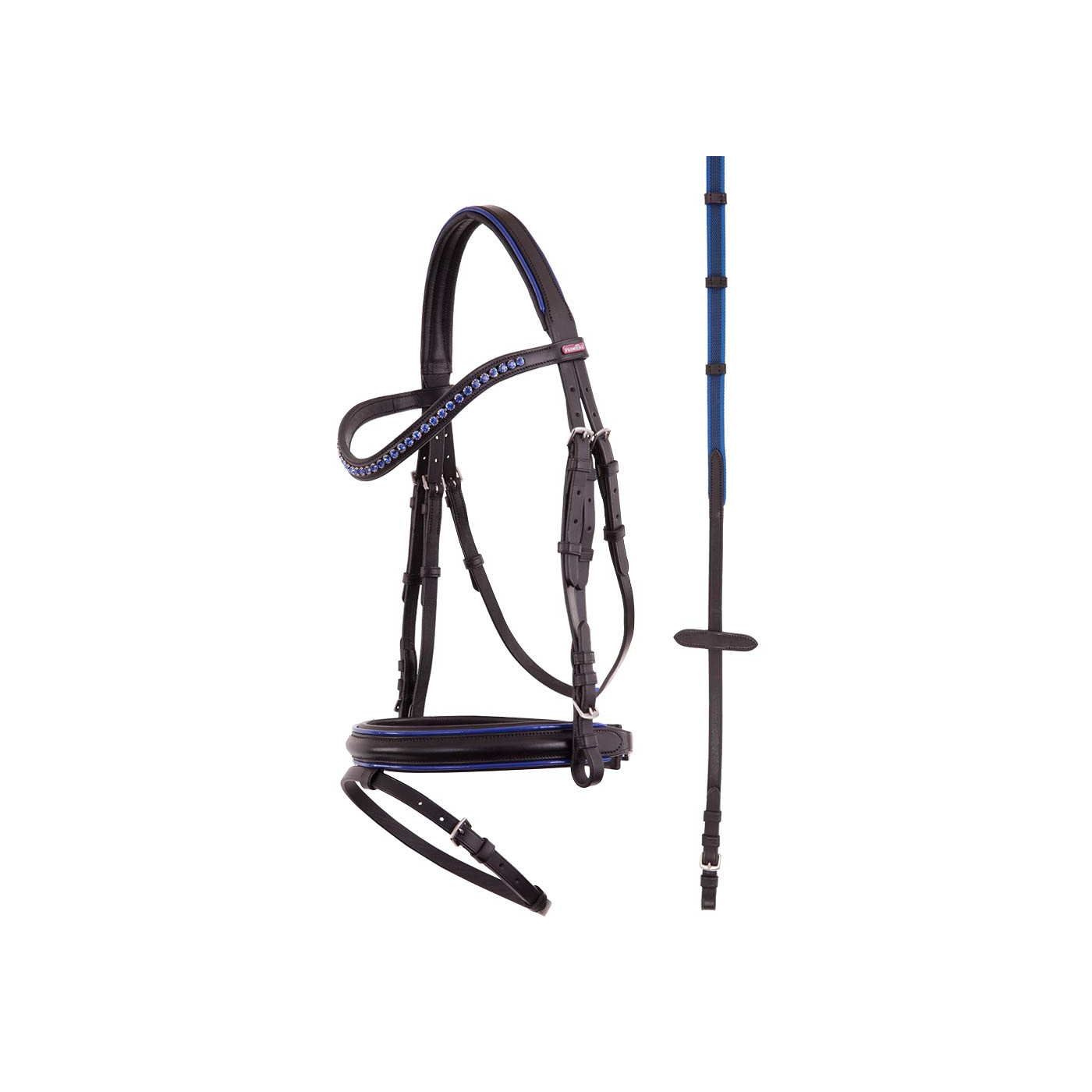 This symmetric bridle is made of beautifully finished leather. Its softly padded headpiece is cut back around the ears and embellished with patent leather piping in contrast colour. The curved browband is encrusted with coloured imitation diamonds and features soft leather facing. The throatlash can be adjusted on both sides and the cheekpieces are fitted with buckles. The bridle has a flash noseband (approx. 3.5 cm), which is embellished with double patent leather piping in contrast colour, similar to the headpiece. The noseband is round raised and softly padded. The bridle features shiny, silver-coloured fittings made of stainless steel and comes with web grip reins in a matching colour. The reins are woven through with rubber for additional grip. The reins feature hand and rein stops and are 20 mm wide.