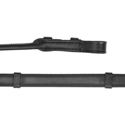 Symmetric bridle with an anatomically formed crownpiece with soft padded lining, which is cut back at both sides. The straight browband is square raised. Its wide (ยฑ 4 cm) crank flash noseband is square raised with soft padded lining and has a chin pad with soft padded lining. The cheekpieces are fitted with hook stud billets. The bridle has stainless steel fittings. The included web rein has hand and rein stops and hook stud billets.