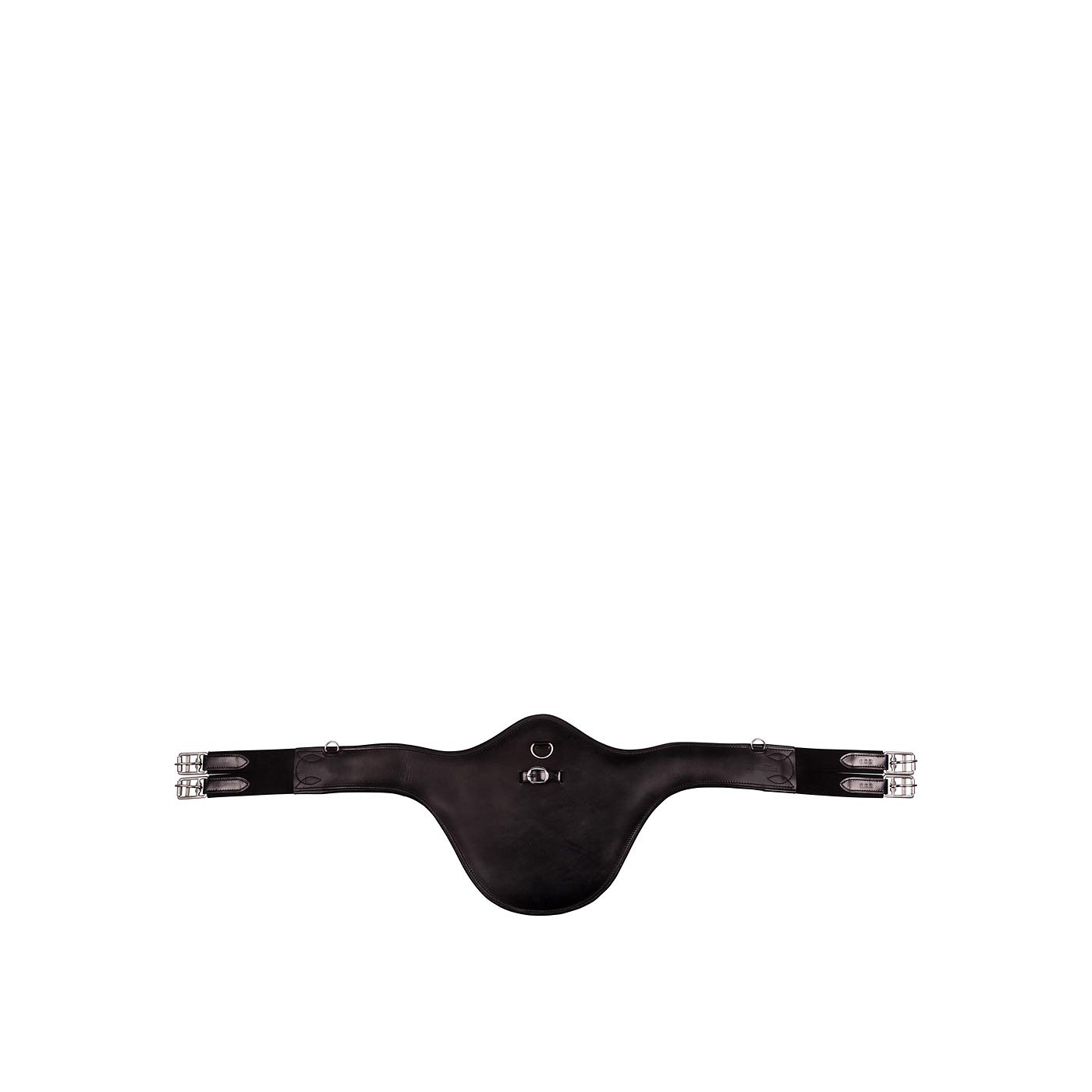 This leather, anatomically shaped girth features elastic inserts at both ends and a centre D-ring and buckled strap for the possible attachment of draw reins. The stud guard is 35 cm wide and provides optimum belly protection when jumping. The anatomic shape of the girth gives the horse maximum freedom of movement. The elastic inserts offer extra comfort and this makes it easier to girth your horse. They also ensure that the saddle will be held in place and in the correct position. In addition, the girth features an extra D-ring on both sides for the possible attachment of draw reins or breastplates. The girth has stainless steel roller buckles.