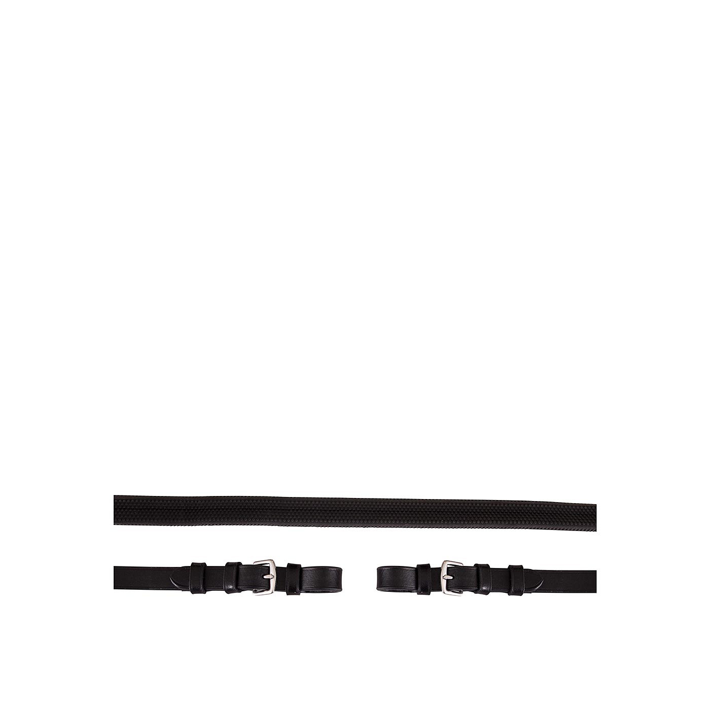Rubber grip rein (16 mm wide) with leather rein stops and strengthened with nylon. The leather ends, with stainless steel buckle closure, are also 16 mm wide.