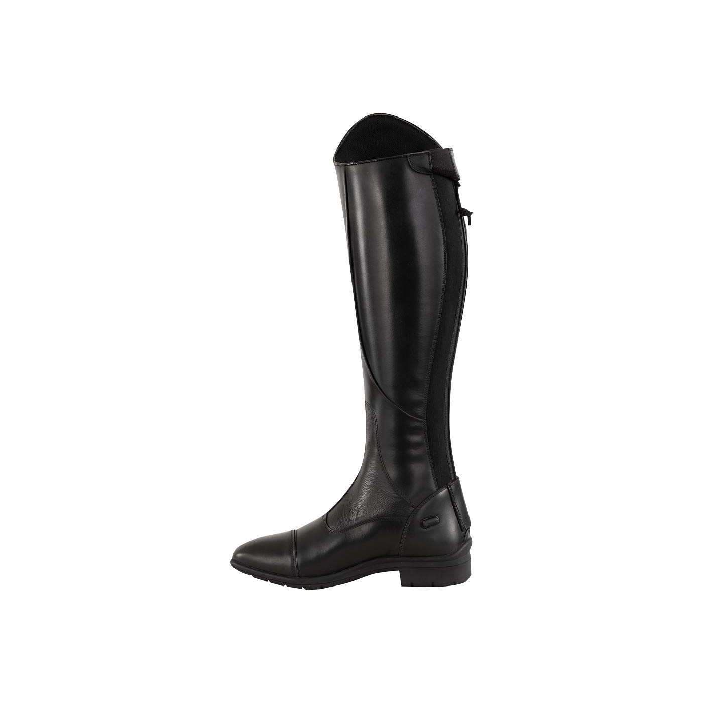 The riding boot fits nicely on the foot and leg because of the long YKK zipper with hidden elastic insert and the elastic lace on the front. On the front (at the top of the instep) there is a more flexible stretch leather insert for extra comfort and freedom of movement. The inner lining is made of non-slip wax leather and the insole has an anti-bacterial top layer for a long lasting fresh feeling. The steel toe cap is finished with a subtle, patent leather trim. The rubber sole has a self-cleaning profile, is sturdy and absorbs shocks. Last but not least, the boot has two spur rests for spur support and the zipper is equipped with a zipper protector.