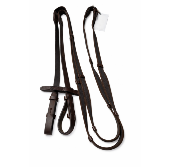 Web rein wrapped with rubber for improved grip. This non-skid rein (16 mm wide) has leather hand and rein stops. Its leather ends, with stainless steel buckle closure, are 13 mm wide.