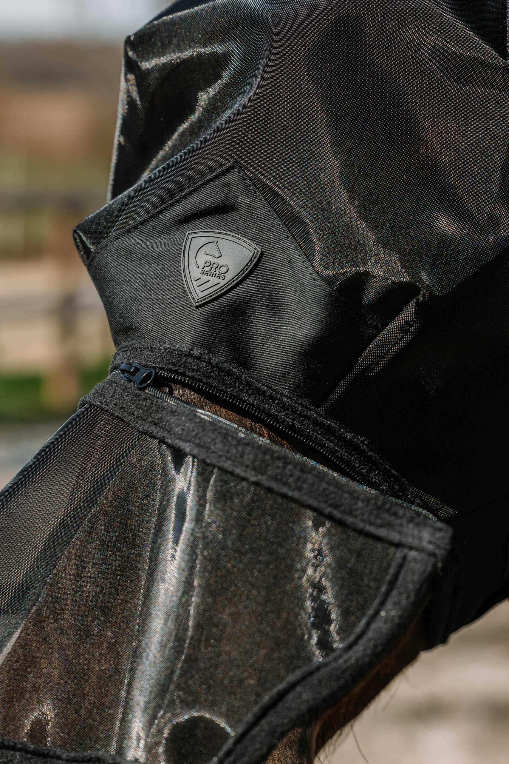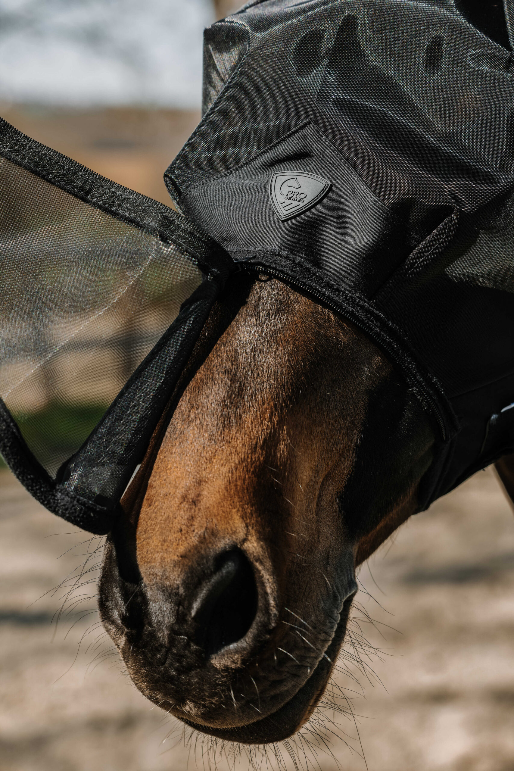 An innovative construction for maximum comfort and unrestricted vision. – Effective barrier: Protects against insects and sun rays with UV 50 protection. – Ergonomic shape: Balloon-shaped structure keeps the mask away from the horse’s head to prevent rubbing on the eyes. – Adjustable protection: Equipped with a removable, zippered nose guard. – Adjustable: Attaches to the throat latch with two hook-and-loop fasteners. DETAILS: – Fleece edging – Wide-field-of-vision design. COMPOSITION: 100% Polyester.