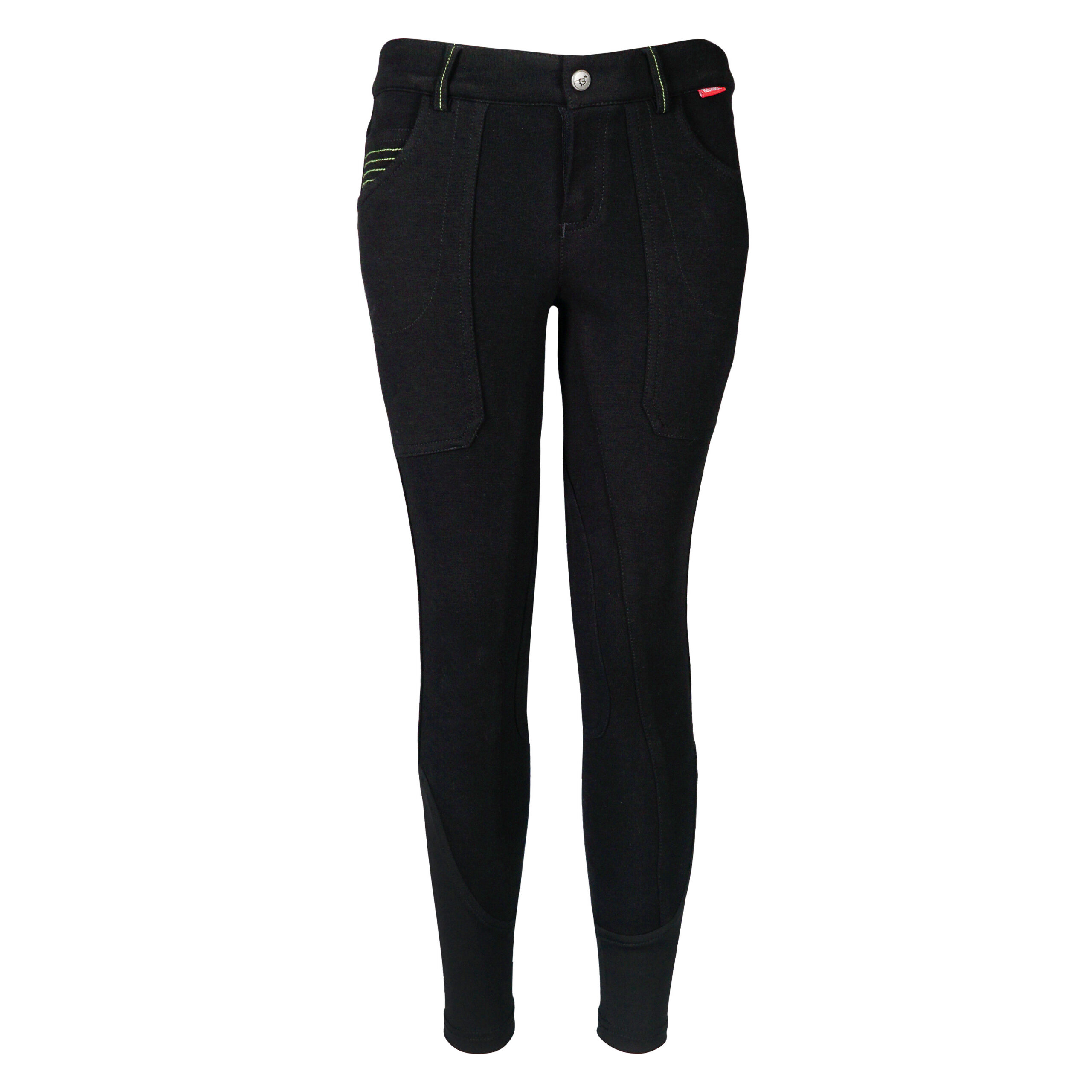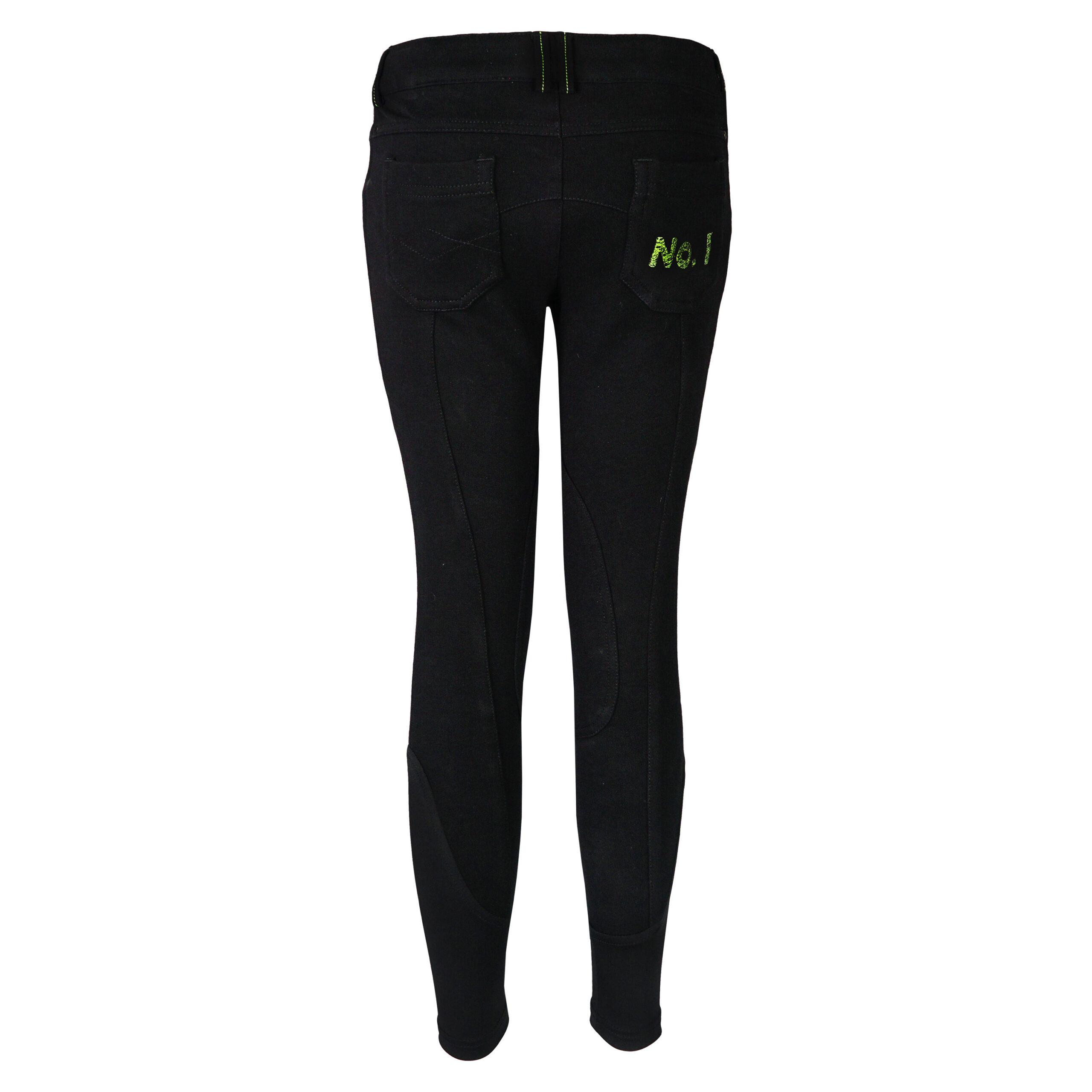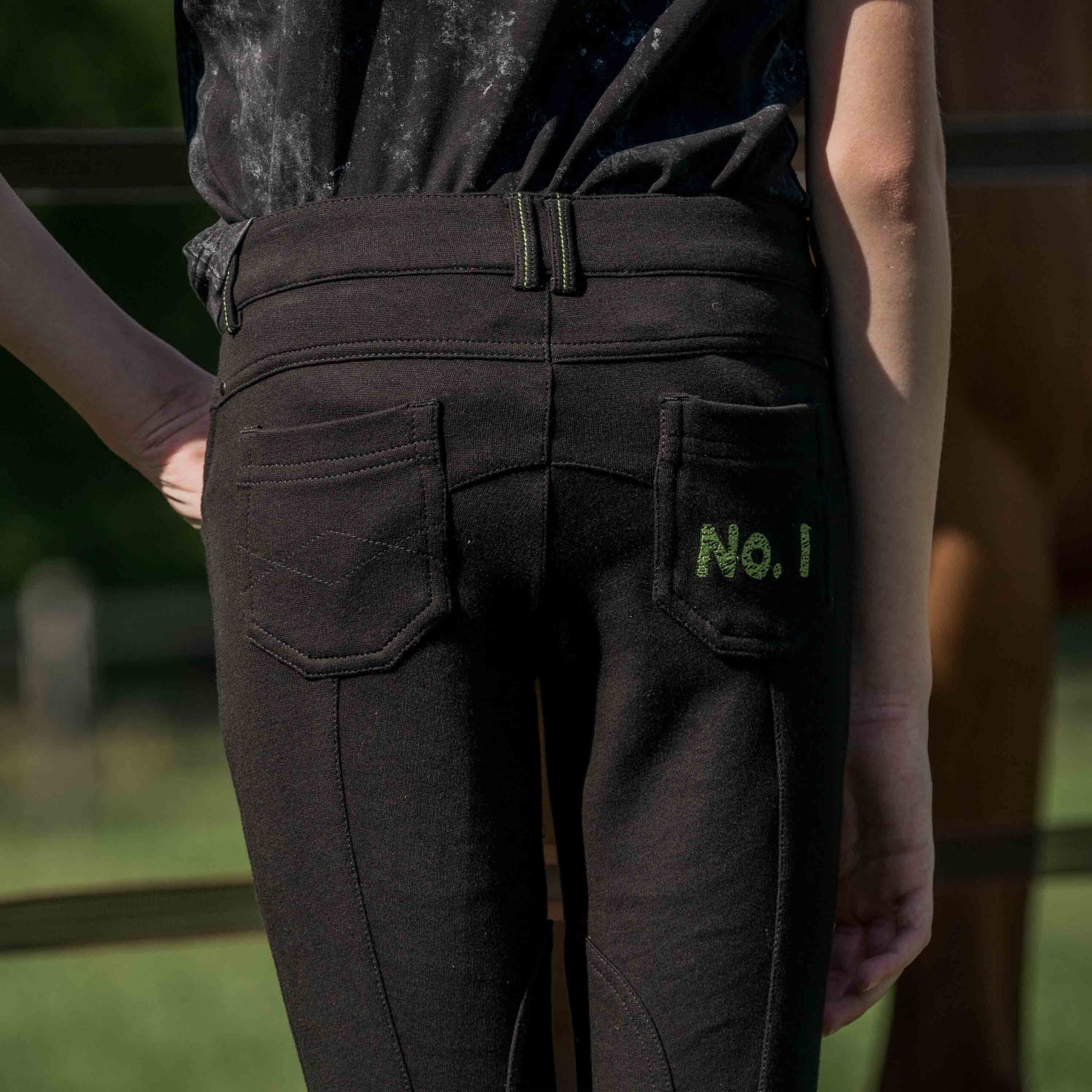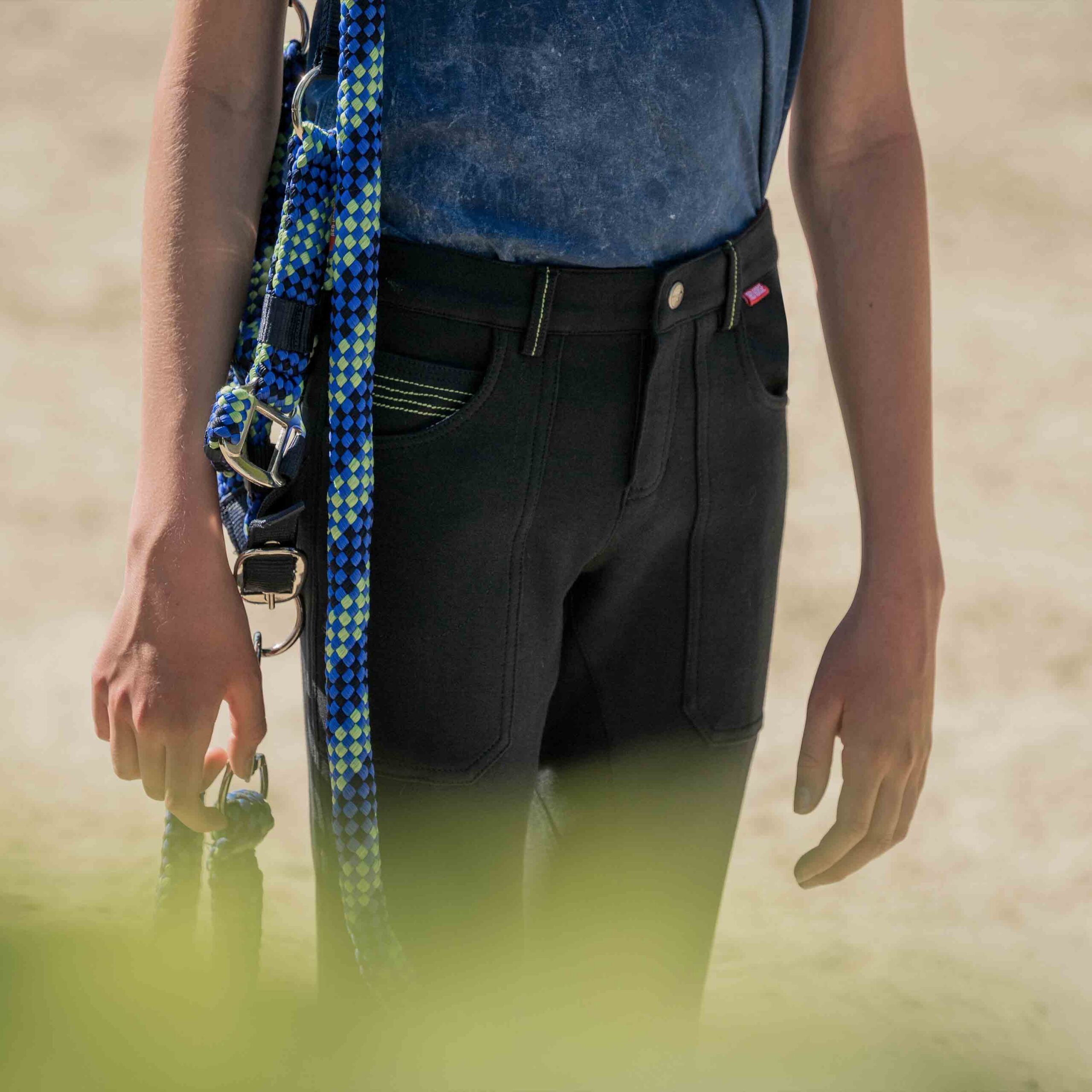 Boys riding breeches with jeans pockets and contrast color accents. There are embroidered