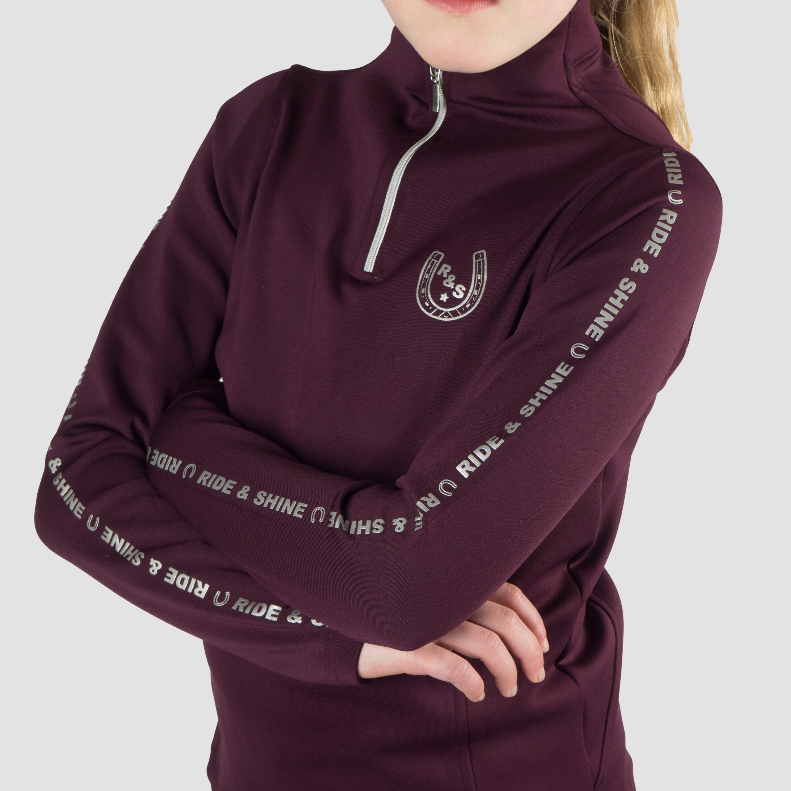 Training shirt with small stand-up collar, subtle rose gold or silver zipper and artwork on sleeves and chest. Product specifications: < Small stand-up collar, subtle rose gold or silver half zipper, rose gold or silver artwork on sleeves and chest, zippered pocket on the back, available in children's and women's sizes, material: < 85% polyester, 15% elastane, 350 gram knitted fabric.