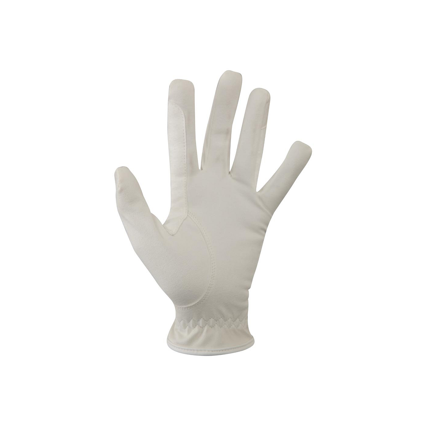 White competition gloves made of supple synthetic leather. The gloves are thin, breathable and fit nicely around the hand due to the elasticated wrist and back of the hand. The gloves feature rein reinforcements and adjustable Velcro closures decorated with imitation diamonds.
