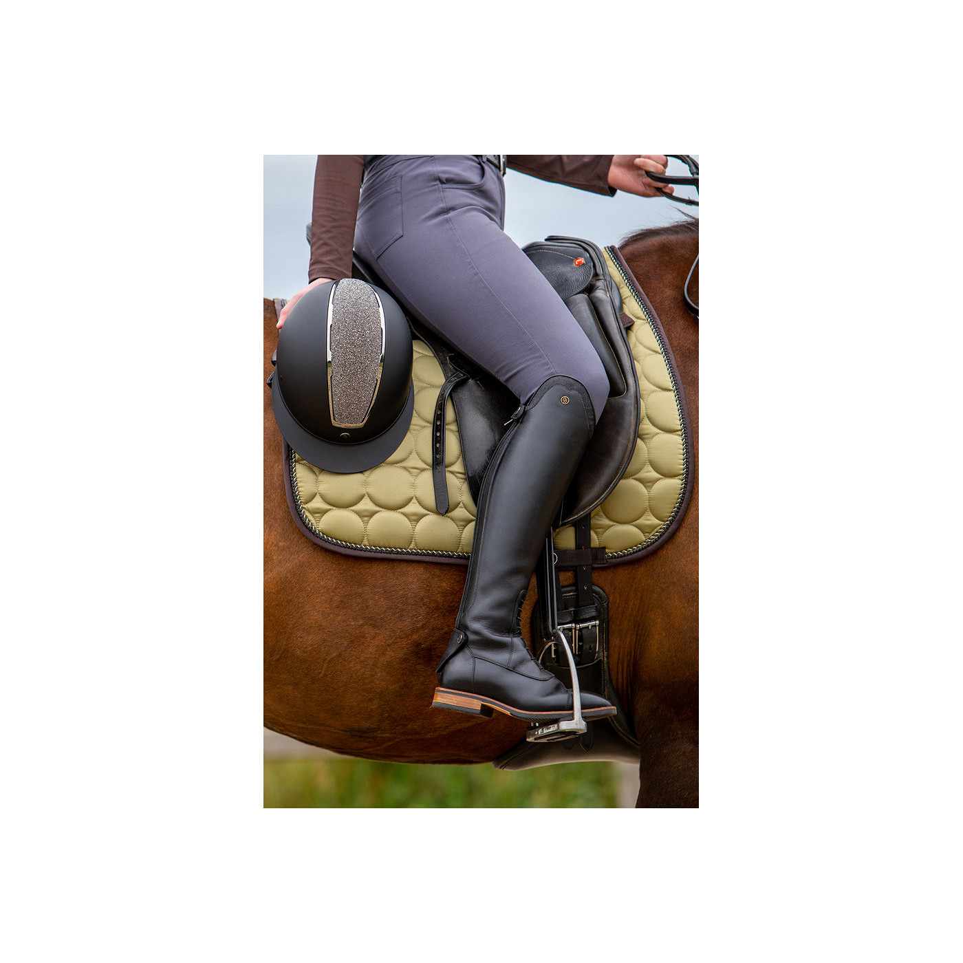 This radiant BR riding helmet Omega Glamourous is a real must-have! The 3D glitter top is situated a bit higher on top of the helmet for an eye-catching effect. In addition, the top is finished with small imitation crystals to make it sparkle even more. The helmet is equipped with ventilation holes for good air permeability and a large visor.