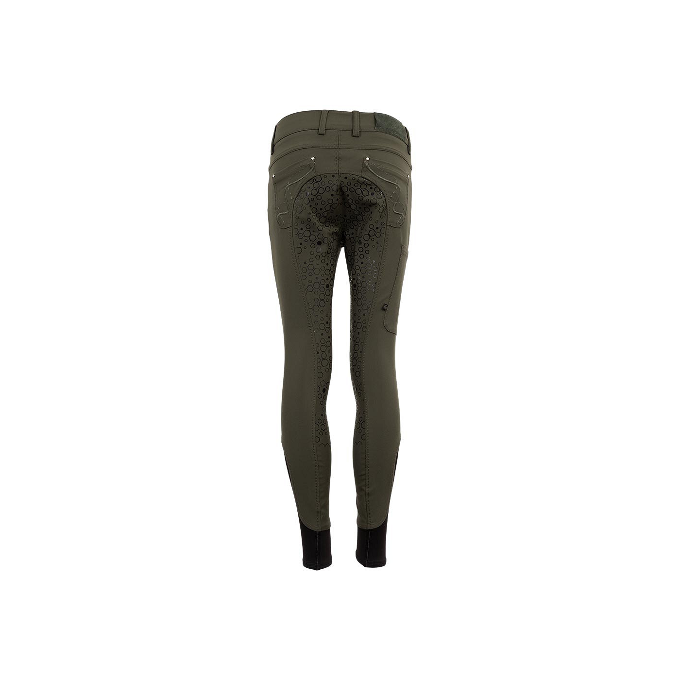 There are two jeans pockets on the front and two patch pockets on the back. On the right leg there is a deep pocket that is perfectly suitable for storing a mobile phone. The breeches feature subtle details, such as the embroidery and imitation diamonds on the back pockets.The stretch waistband with belt loops and elastic lower leg inserts ensure a nice, tight fit. The silicone seat with graphic pattern ensures a stable seat.