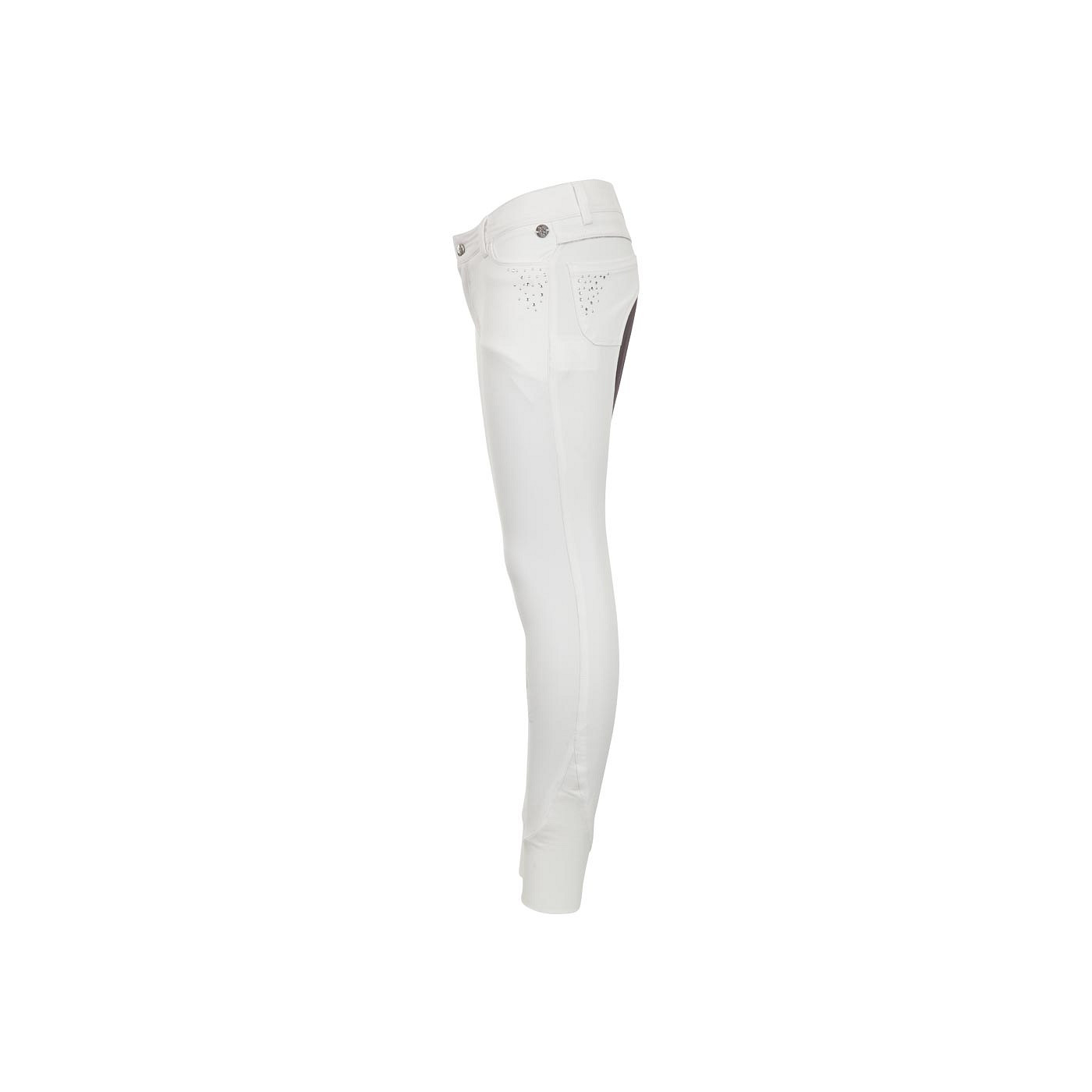 These 5-pocket style competition breeches are embellished with various stylish details. Below the two pockets in the front and on the pockets in the back, the breeches are decorated with imitation diamonds alternated with silver coloured studs. Above the front left pocket, the breeches are embellished with a silver coloured, metal BR logo. The grey self-fabric seat is a striking detail. The breeches are finished with shiny silver coloured piping on the coin pocket and over the entire width just below the belt loops. Elastic inserts on the bottom of the riding breeches guarantee optimal comfort. The breeches have an adjustable waistband with buttonhole elastic and belt loops.