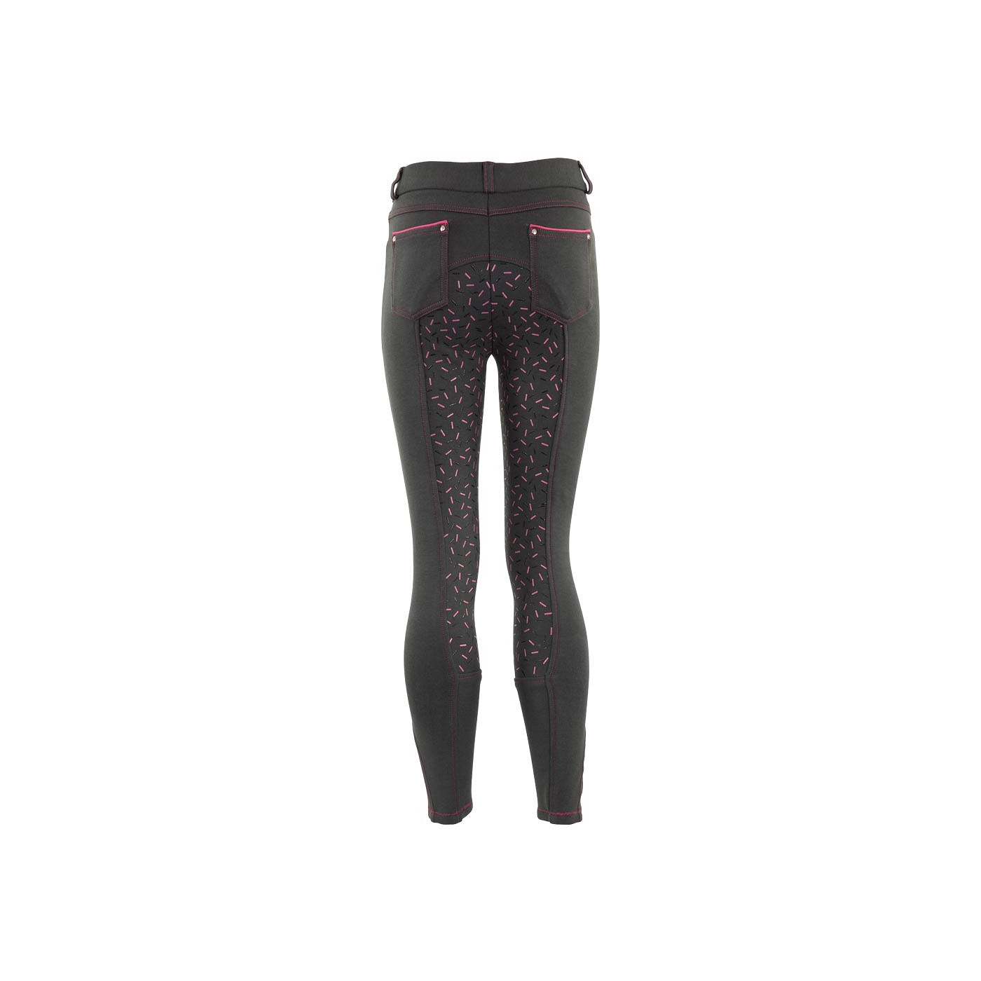 These trendy childrenโs riding breeches in knitted quality have a close fit and a playful silicone grip print on the self-fabric seat. The silicone print provides additional grip and a more stable seat. The riding breeches features two jeans pockets at the front and two patch pockets at the back. All pockets are embellished with shiny studs and pink piping. In addition, the whole breeches are decorated with pink contrast stitching. The stretch waistband features belt loops. The elastic lower leg inserts ensure optimal comfort in the riding boots.