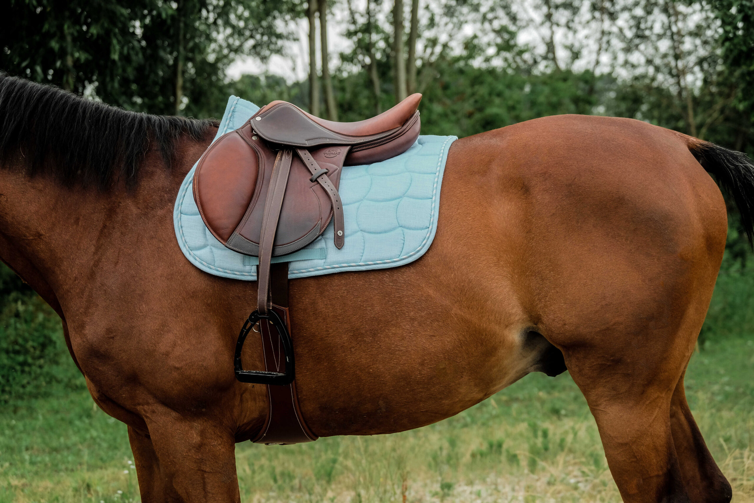 Pastelsetes vรคrvides stiilne puuvillane รผldvaltrap, mis รผhendab praktilisuse ja elegantse vรคlimuse. Hingav vooder aitab niiskust kiiresti รคra juhtida, hoides hobuse selja mugavalt kuivana.