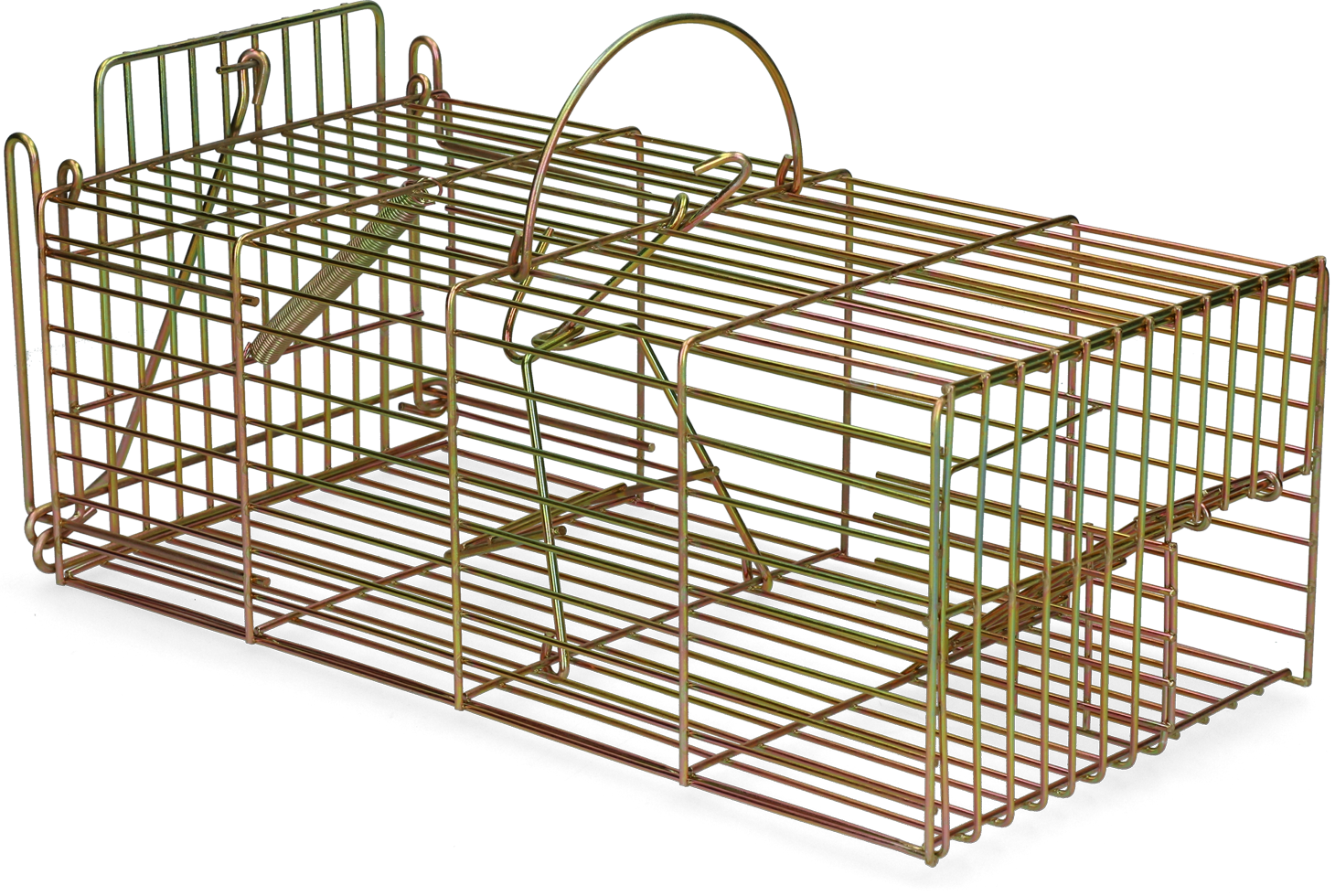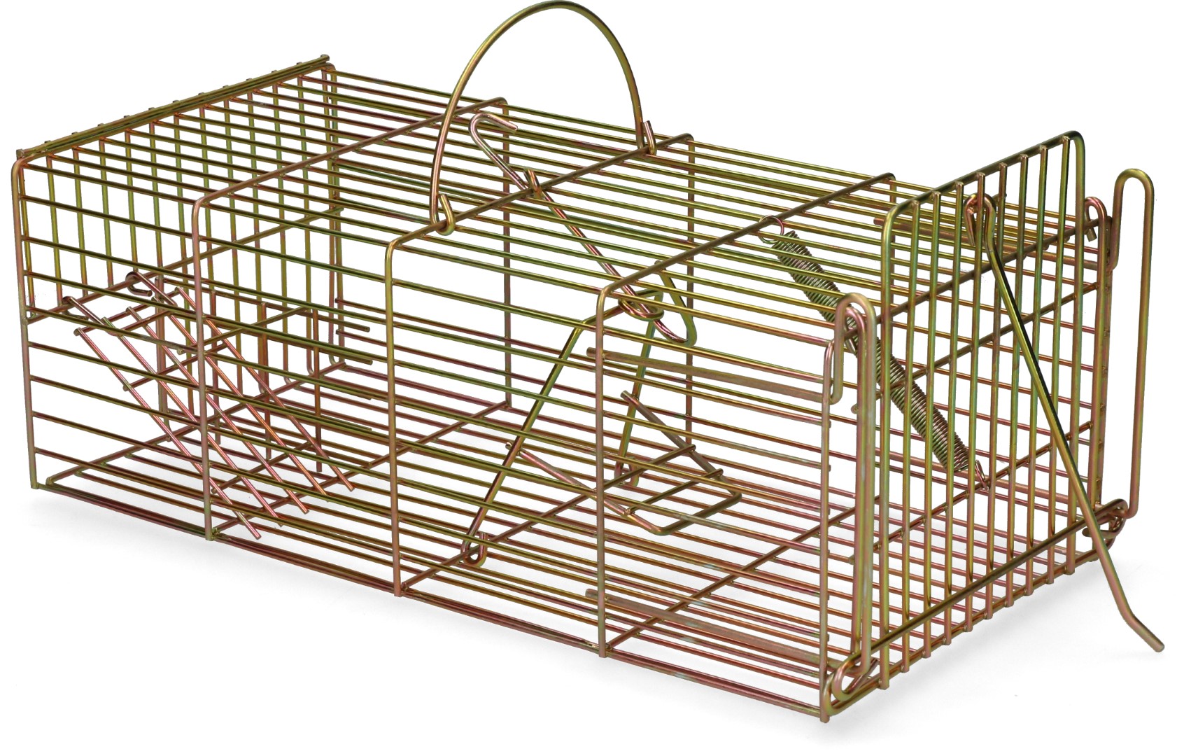 The cage is equipped with a large and a small opening. The large opening is activated once a rat tries take the bait.