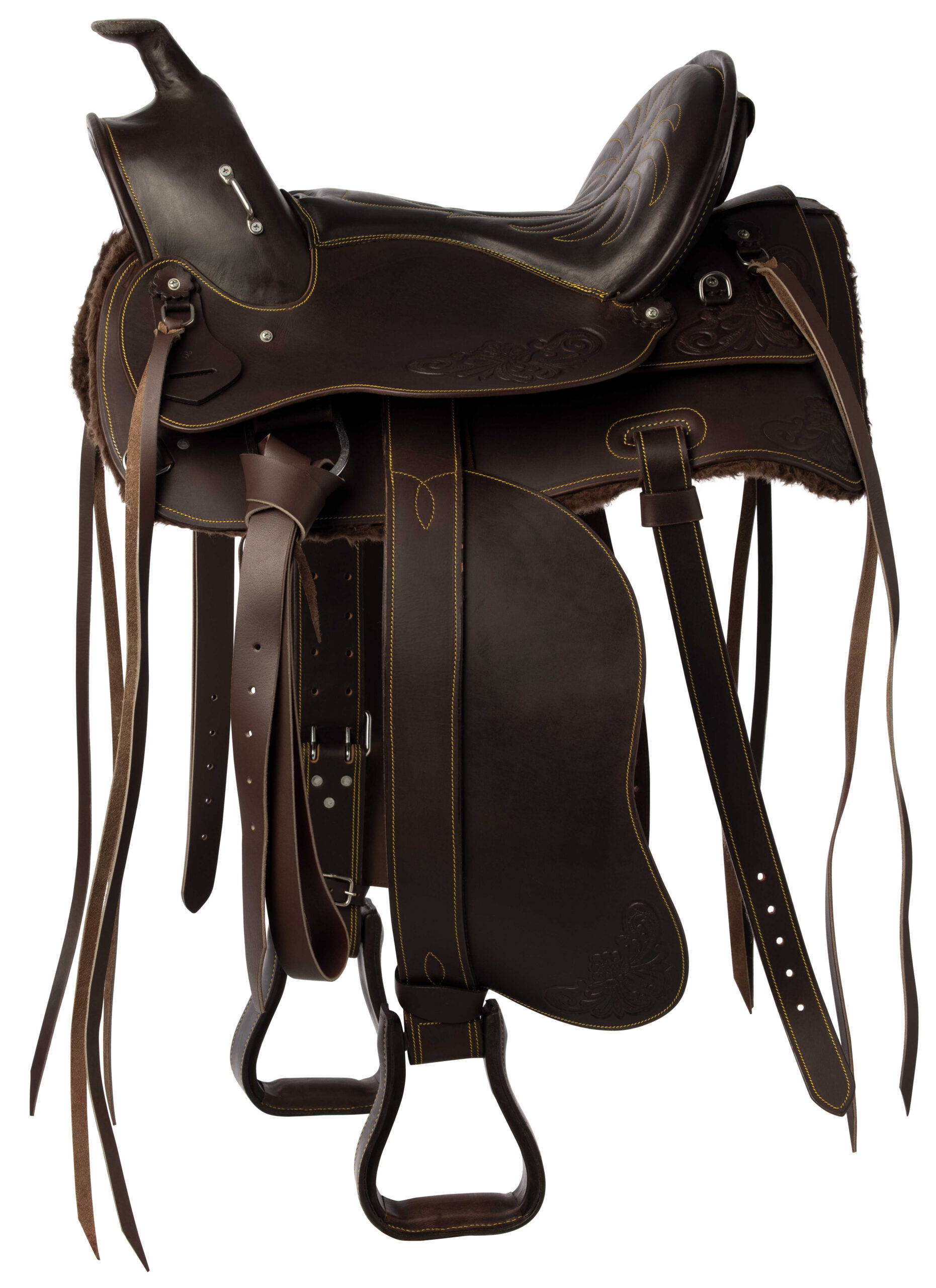 – Comfort: Synthetic sheepskin-lined panels, adjustable fenders and wooden stirrups covered with leather.