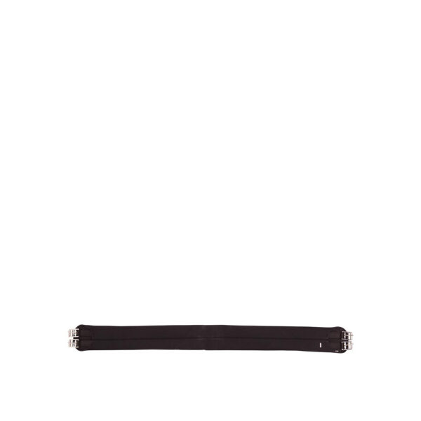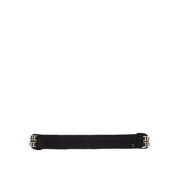 Neoprene girth, covered with velvet and with stainless steel roller buckles. Very comfortable because of the breathability and moisture management